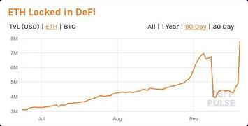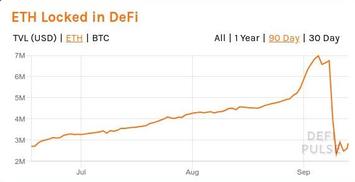 Неоднократно говорил ранее (например, в той же заметке DeFi: бег по граблям), что новомодное "доходное фермерство" будет стремительно смыто в унитаз при первых признаках разворота рынка. Не сказать, чтобы рынок уже глобально перешёл в новую фазу обвала, подобную мартовской. Но именно признаки разворота уже более чем проявились - курс того же ETH в первую неделю сентября сильно упал из-под почти 500 USD до примерно 322 USD (падение составило около 35%). И это не замедлило сказаться на "рынке" DeFi: